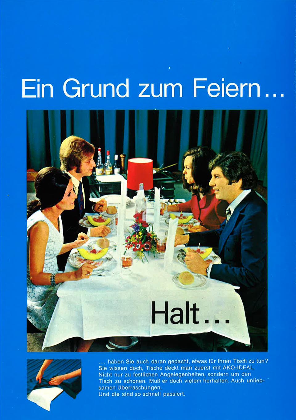 Die Tischdeckenunterlage AKO IDEAL feierte 2022 ihr 55-jähriges Jubiläum und braucht sich nicht zu verstecken. Denn praktisch wie unauffällig sorgt sie seit 1967 dafür, dass alles auf der Tafel an seinem Platz bleibt und die Tischoberfläche geschont wird.